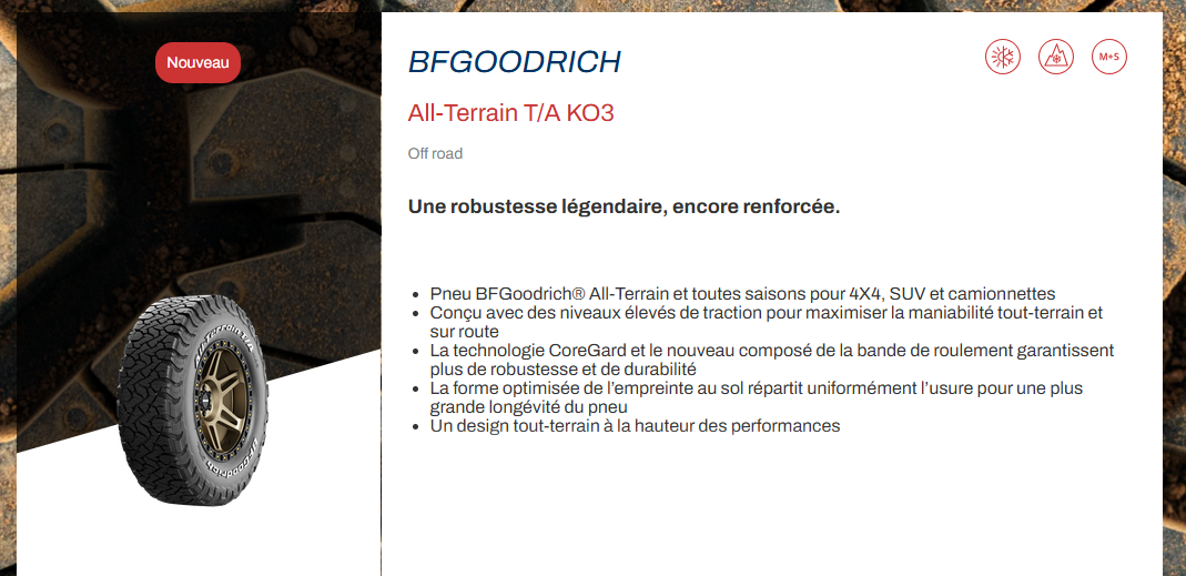 Le BFGoodrich All-Terrain T/A KO3 est un pneu tout-terrain conçu pour offrir une excellente traction et durabilité. Voici quelques caractéristiques clés :